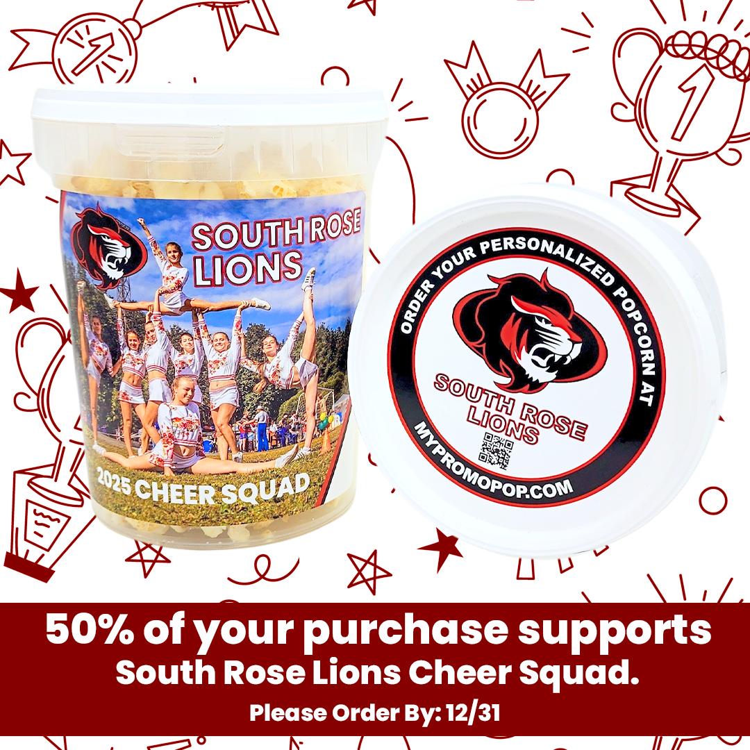 Show your Love and Support for South Rose Lions Cheer Squad, with this exclusive 4-pack popcorn set. Choose your favorite flavors to fill these eye-catching, resealable, and reusable buckets, making it the perfect treat, and most delicious way to show your school spirit!